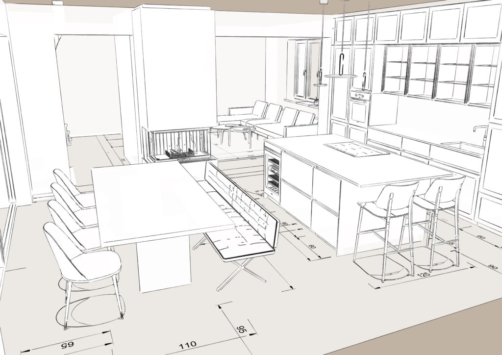 Wenn Materialität oder Farbkonzept noch offen sind, wird häufig ein Zwischenschritt gewählt: Eine reduzierte 3D-Skizze (vergleichbar mit einer „3D-Bleistiftzeichnung“). So kann sich der Fokus zunächst auf Raumkonzept, Proportionen und Möblierung richten, bevor Details festgelegt werden. Durch die enge Zusammenarbeit mit unserem Interior Design Partner aus Wien können Möblierungskonzepte im Showroom realisiert werden.